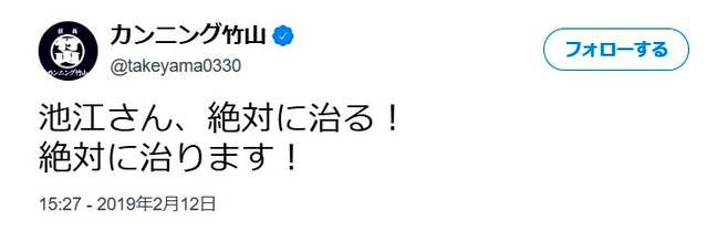 しかし上に掲げたツイートからは、そのような縁深さや病魔への憎しみを感じないばかりか、無根拠に治癒すると断言する、思慮の無さが際立っている。カブトムシ氏の味は、キレ芸とも評される良い意味での遠慮の無さだが、このタイミングはどうなのだろうか。相方は治らずに死んでしまったのである。それを何故、「絶対に」と2回も言い切れるのか。心情を全く推し量れないし、そのため真に共感できないのである。いや、言うのは簡単ですけど、あんたんとこ死んではりますやん、と思う人が、少なくとも数人はいるだろう。