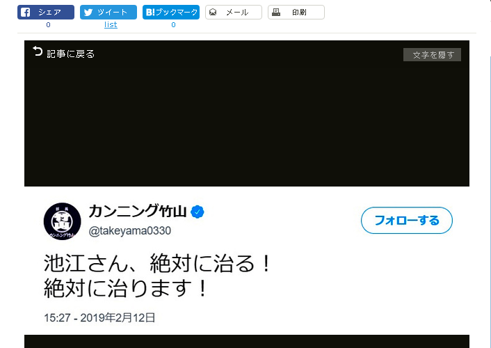 著名人のコメントも多く報道されている。東京五輪が絡んでいただけに政治家もぽんぽん発言する。心配です、祈ります、焦らず静養して、等といったことを述べ立ててればよいわけだが、ここに一人、絶大な違和感をもたらしてくれる男がいる。カブトムシさいとう氏である。