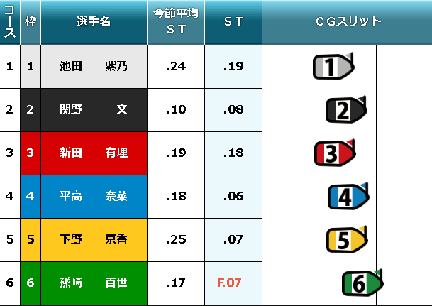 まずはスタート展示からだが、6号艇が非常識なフライングとなっている程度で、日常的なごくごく普通の展示である。