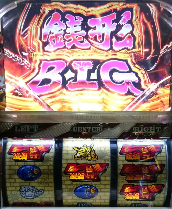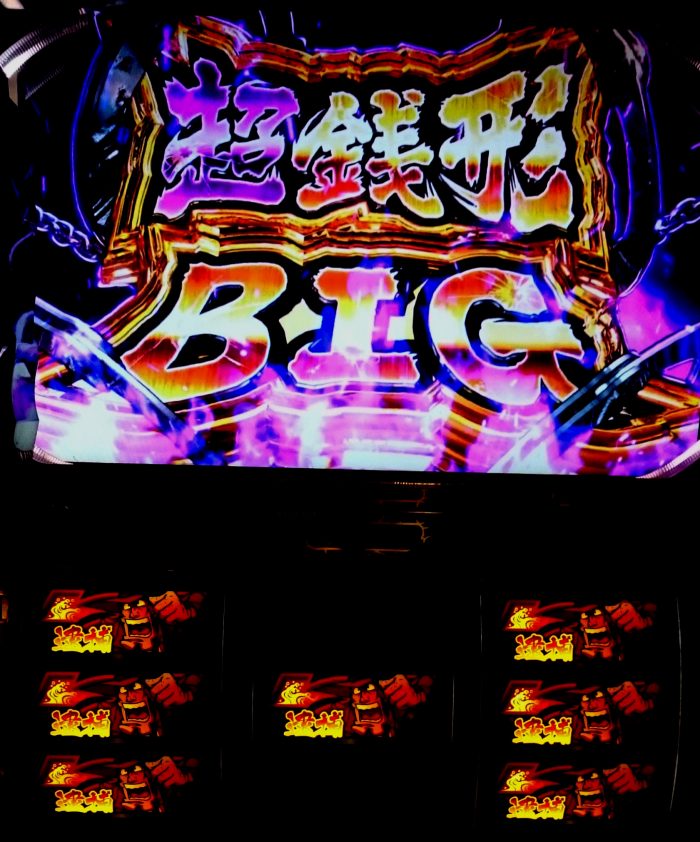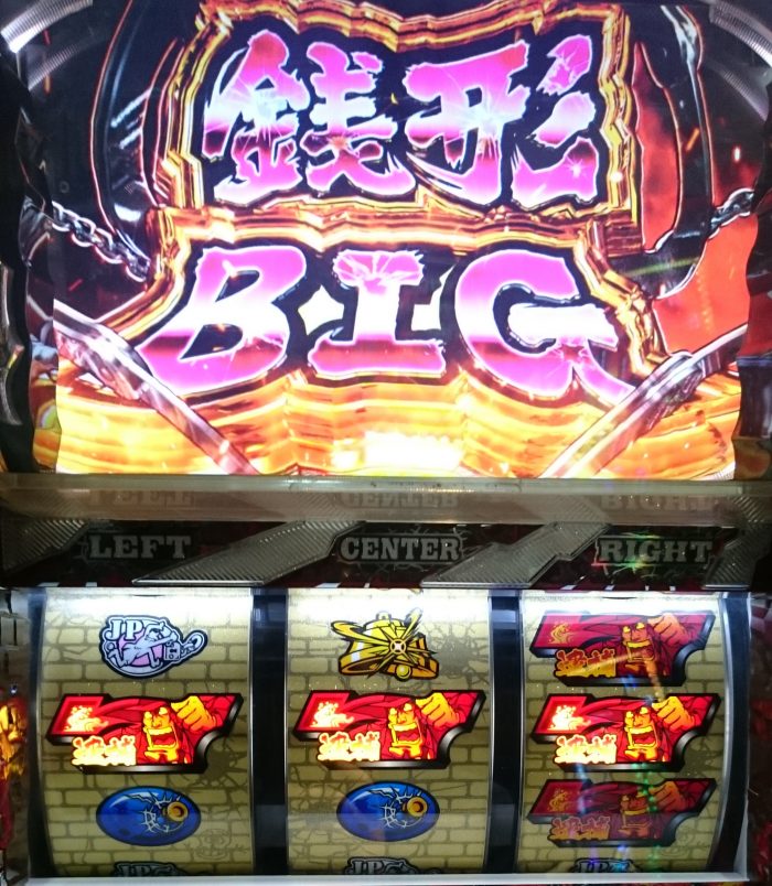 ここで注目したいのは、揃え方である。銭形BIGは、3列だろうが1列だろうが、必ず右リールから止めることを強制される。やたらと遅く目押ししない限り、右には3連7が揃う。すると山寺宏一氏に「がっはっはっはっは」と笑われる。これは初代、4号機の主役は銭形において、左リールに3連7を止めた際に納谷悟朗氏が笑ってくれた内容と同じである。もっと真似て欲しかったとは思うが、古参スロッター達はこの3連7をスブンと押す度に、温故知新を地で行くような気持ちになるのである。次に中リールを押すと、「じゃっきーん」と言われる。これも初代の真似だ。ちなみに初代では、REGボーナスの場合は中段に赤7が止まらない仕様になっていたが、二代目にはREGがないので、よほど下手を打たない限りは、まず中段に止まる。