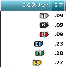 スタートタイミングは綺麗なものであった。1、2、3号艇の内側勢が、ピッタリ並んで.09という好スタートを決めている。