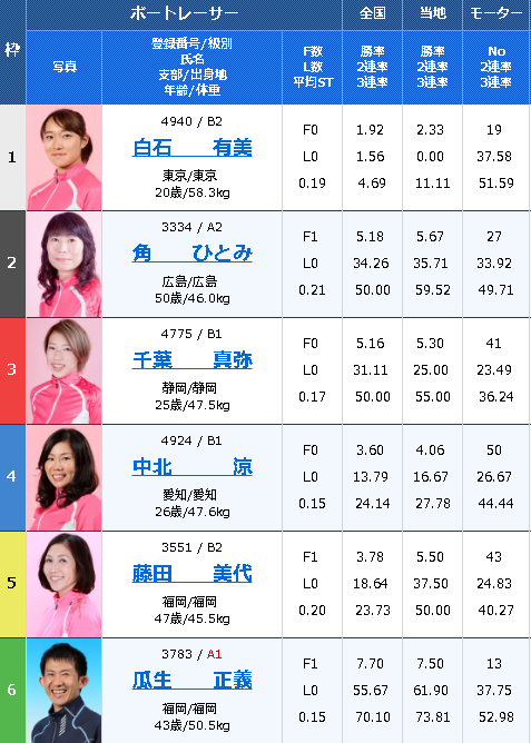 また中北涼選手がセッティングされているが、今回は4号艇であり、1号艇のお供となるのは厳しい位置関係だ。ここで注目すべきは、6号艇に鎮座する福岡のフライングヒーロー・瓜生正義選手(A1/76期/福岡/43才)ではなく、3号艇の千葉真弥選手(B1/112期/静岡/25才)である。