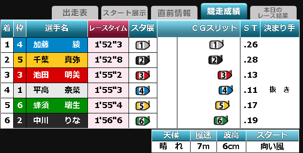 対して、ちびま●子ちゃんの山田よろしくバカみたいにフライングを3回切る前の平高選手は、A級もA級。競艇選手の上位20%、偏差値65以上とも例えられようA1級選手であった。フライングの罰としてB級の最下層で破廉恥に喘いでいるが、今回の出走メンバーにあっては、その技術差たるやまさに雲泥である。