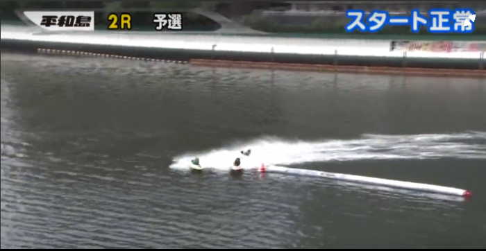 上掲の画像は、2マークを控え、先に旋回するべく白石有選手が減速を始めた直後と、さらにその数瞬後を切り取ったものである。見た目では、既に外の6号艇、内の2号艇に追いつかれてしまった感があるが、いやいや、これは白石有選手が、我先にと旋回に入ろうとしているためであり、さして問題ではない。他の二艇も、ここから急失速、差は広がり直すはずだ。そうに違いない。