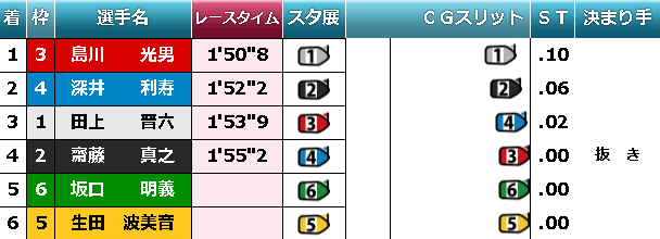 .00。せっかくのタッチスタート成功であったが、内側二艇がぴったりと付いていたのでは、さすがに大外コースはどうしようもない。B2級の腕では最下位に甘んじるのも仕方がないといえよう。繰り返すが、ただ隣に並んで走っただけなのだから、大外では最下位も当たり前に有り得る話で、決して大した話ではないのだ。断じてフライング気質ではない。