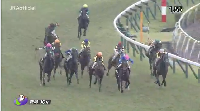 2019年10月19日、新潟競馬場の芝2200mコースで行われた1勝クラス11頭による特別戦。四番人気サンアップルトン(牡3/1勝/東/中野栄)と初めてコンビを組んだ柴田善騎手だが、テン乗りの手探り感を全く表に出さなかったのは流石のベテラン振りであった。道中はゆったりと後方に構え、