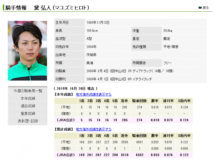 本年僅か5勝、お手馬だった筈のサンアップルトンが柴田善騎手を背に勝利した2019年10月19日の時点では4勝に過ぎなかった。数年前に重賞勝ち鞍はあるものの、伸び悩む三十路、失礼ながら岐路に立つ中堅といっても過言ではなかろう。