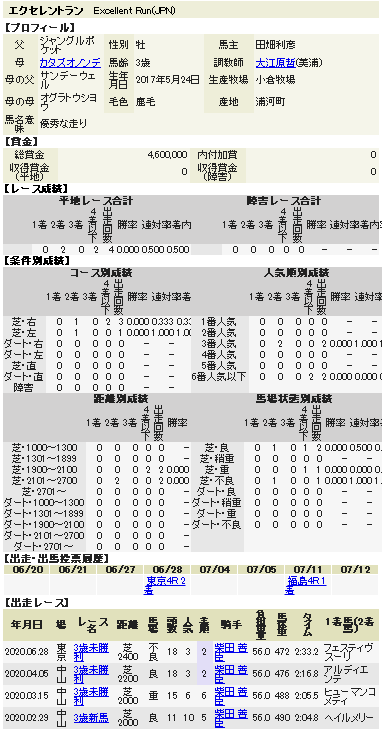 2020年7月11日、福島競馬場の第4Rに組まれていた3歳未勝利の一戦。芝2600mという、未勝利クラスとしては珍しい長距離戦に、柴田善騎手はエクセレントラン(牡/父ジャングルポケット/大江原厩舎)と共に臨んだ。エクセレントランはデビュー当時から一貫して柴田善騎手を鞍上に迎えており、ここまで四走。そのうち掲示板には三度も載り、直近の二走は何れも2着という非常に惜しいレースが続いており、何はなくとも実力上位であることは疑いようが無かった。