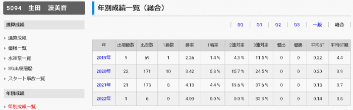 上表の通り、ボートレースを取っ付きにくくしている特殊な計算式による「勝率」こそ、デビュー年から順当に上昇しているものの、三年目にして二桁勝てなかったのはA級を志すには心許無さすぎる。
