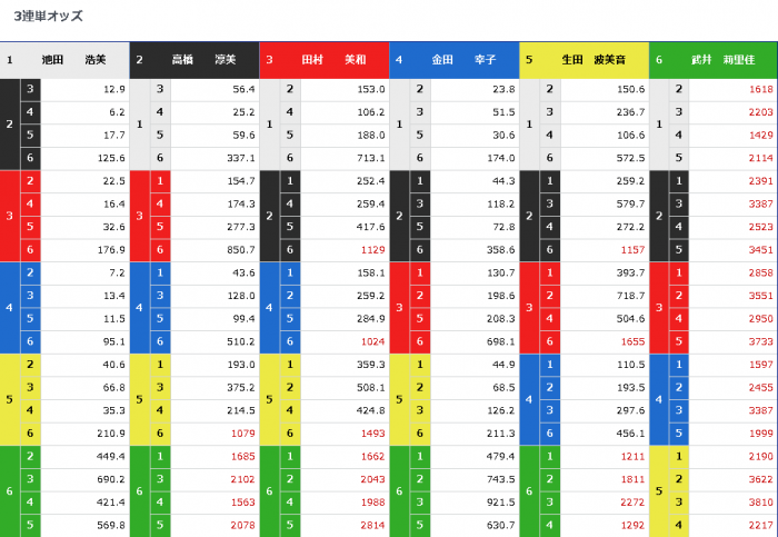 故にオッズは上掲の通り、1-2-4、1-4-2の折り返しを筆頭に、1-2-3、1-4-3、1-3-4等、A級ベテラン一号艇から、四号艇までで決まるだろうという判断が大筋を占めていた。1-4-5、1-2-5と、五号艇生田選手が絡む舟券で10倍台を付けたものもあるにはあったが、「せいぜい三着までなら、ありえるか」という程度の評価に留まっていたことは疑いようがない。何しろ1-5となると途端に倍率が跳ねあがり、最も安くても35倍を付けてしまうほどなのだ。5アタマとなると当然の如く全万舟である。