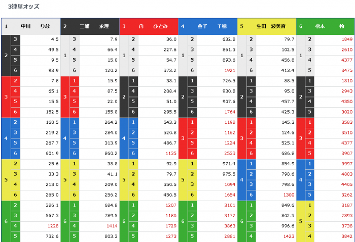 一番人気は当然のように1-2-3。それも4.5倍という低倍率であった。二番人気が1-3-2の7.8倍、三番人気も2-1-3の7.9倍に過ぎず、内三艇だけの運動会、といった塩梅だ。四番人気が1-2-5の9.5倍で、生田選手絡みの舟券が早速に出現するあたり、舟券師たちの欲と読みを感じさせるが、それもその筈、外の三艇は生田選手以外はボートレース勝率2点台のB2級選手なのだから、酔狂な大穴狙いでもしなければ手など出しようがないのだ。だからA級選手たちの争いに紛れ込めるとすれば、生田選手がその筆頭格だし、彼女以外には考えにくいのである。2-1-5が15倍、1-3-5が15.5倍と、生田選手が3着にまで辿り着けると読まれた舟券はそこそこの低倍率をつけてはいるものの、やはり基本のキたる1-2-3が5倍を切っている事実は無視し難い。順当決着が容易に想像された一戦であった。