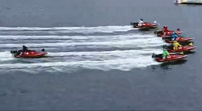 かくして、上掲の出遅れをもってしても、極めて平和的な枠なり三対三のコース進入が完成されたのだった。本命を熱く厚く買う舟券師たちは、大いに胸を撫でおろすところであるが、しかし、遅れた挙句に温情で入れて貰った当事者の精神状態は、決して平穏ではなかったことに、どれだけの本命党が思いを馳せることが出来ただろうか。二号艇選手が抱えこんでいた実際のお気持ちは、ほどなく、そのスタートを持って大層えげつなく表現された。
