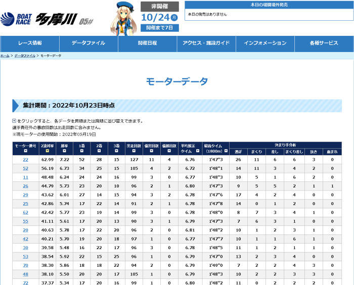 そして、区切りとなる一節に相応しい大幸運として、開催前日のモーター抽選で生田選手が所謂超抜モーターである22号機を引き当てたことには特筆せざるを得まい。今年五月から使用を開始して、既に優勝を4度も経験しており、何より驚くべきは、これまでの13節で、実に11節も優勝戦に絡んできているという、非常に高いレベルで安定した成績を持つ、お化けモーターであった。