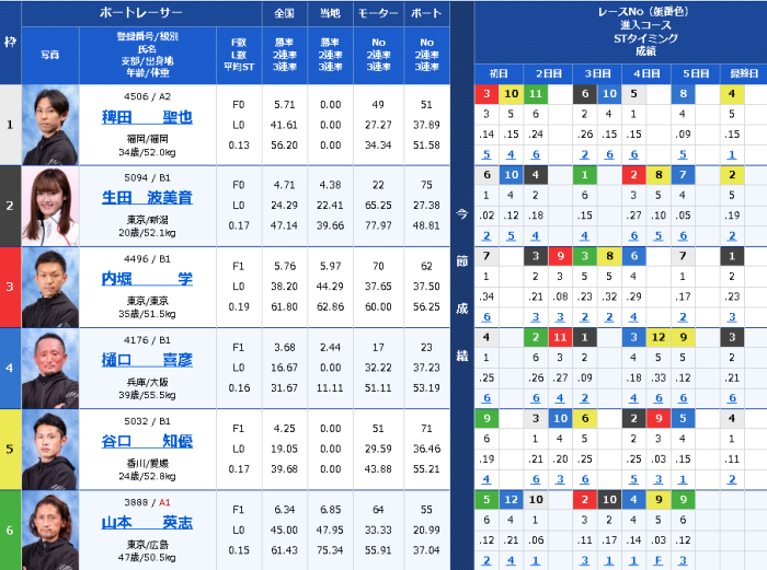 二号艇に鎮座する生田選手の内側にはA級選手が配されているが、外側の四人は全員がフライング持ちという状況だ。その中には節間3勝を挙げたA1選手もいるが、如何せん六号艇ともなれば勝ちには遠い。今節では二度緑色のカポックを纏ったものの、それぞれ2着3着となんとか舟券には絡んだものの、今走でも「勝つとなると…」と食指が鈍った舟券師達は少なくはなかった。