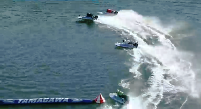 位置関係としては一号艇に分があるようだが、三号艇の舳先がかかり、その三号艇には生田二号艇の舳先が掛かっており、一号艇とは一艇身の差がありながらも、二号艇にも充分勝機が見える態勢のまま、二マークを迎える。ここからが超抜モーターらしさであった。