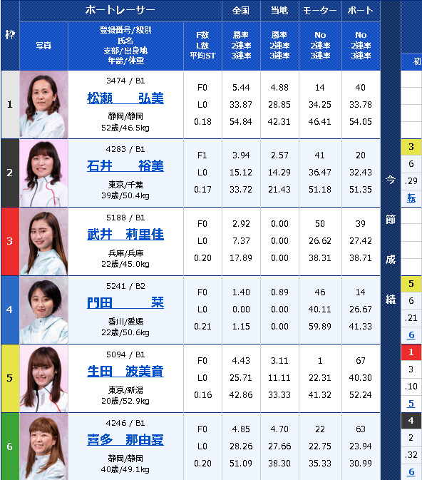 オールB級の小粒な面子で勝機を感じさせないこともないが、生田選手にお供するモーター勝率はやはり最下位で、当地4.88といえども全国で5.44というA級でもおかしくない勝率を誇る大ベテランが一号艇に鎮座していることを考えると、なかなか五号艇を頭では買いにくい。すぐ内のB2級とさらに内のB1級、両後輩選手の平均スタートタイミングが生田選手よりも0.05遅いことから、スタートで両者が凹んでくれれば一息に……という予想も立ちそうだが、如何せんさらに二梃も内にいるとなっては難しい。