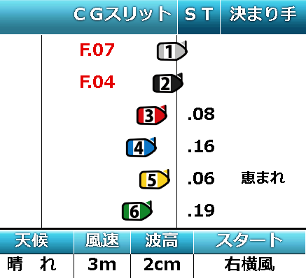 四号艇を飲み込んだ勢いのまま、三号艇へ横づけし、ツケマイ敢行、かつ一号艇の内へ差しハンドルを入れようと、これ以上やりようのない完璧な仕掛けっぷりであったが、モーター性能や体重差もあって流石に届かない。一号、二号に次ぐ力と技の3番手で1マークを回り切り、ここから2番手へ上がれるか、それとも舟券外に零れてしまうのか、白熱のレース展開が巻き起こる構図であった。しかし、そこでスタート判定の結果が知らされる。
