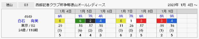 そのような体たらくであった者が最下位0回ともなれば、今節の白石有選手が如何に調子よく走れているか、過去を振り返れば振り返る程に噛み締められたる4着五回5着二回なのである。
