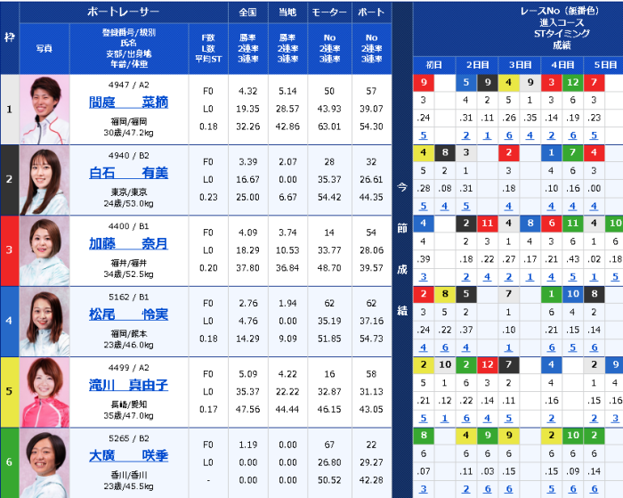 さて、相手関係を見てみると、ここでも白石有選手が決して見劣っていないことがわかる。ボートレース勝率で彼女を下回る選手が二名もいて、内側の一号艇はA級選手だとはいうものの、そのボートレース勝率は4.32と、A級とは誤植なのではないかと疑うほどの低い数字であり、おまけに白石有選手よりも一期後輩であった。