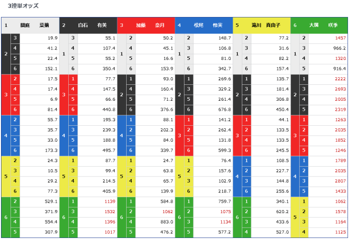 そう考えると、いくらこの7年近くでたったの2勝しか挙げていないとしても、白石二号艇アタマの舟券も考えられなくはない。2-1-3の55.1倍と3-1-2の50.2倍という数字からは、一号艇が逃げられなかった時のアタマで悩みに悩み、舟券師たちの決断がパックリ割れたことがはっきりと伝わってくる。節間2勝2着二回の三号艇が優勢なのは当然であるが、一度たりとも舟券に絡んでいない白石有選手がその次に支持されているのだから、今節の彼女が一味違うことは充分に認められているといえる。