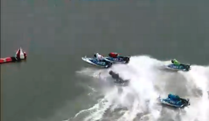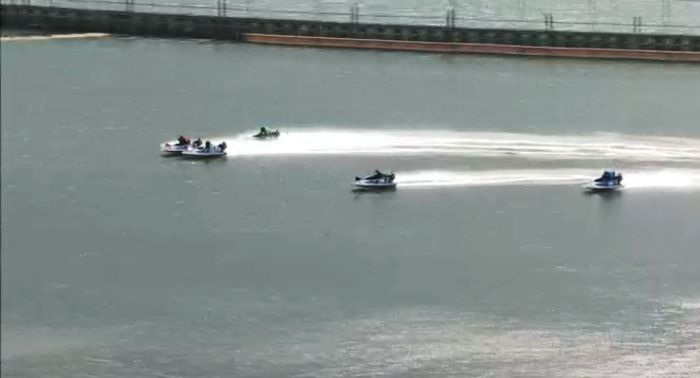 <一号艇は三号艇を押し退けるように外へ。その間に白石有二号艇は悠々と波の無いところを差してくる>