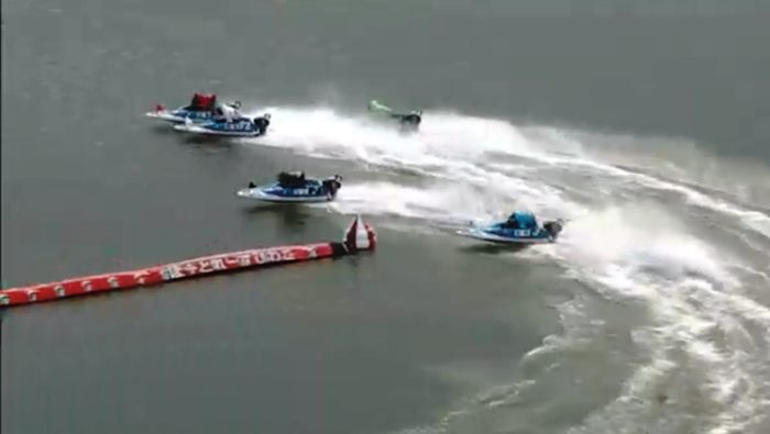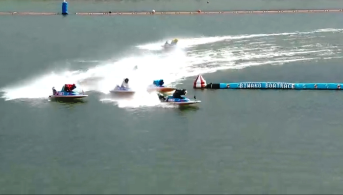 <一周目2マーク。きっちり先行して回り切った白石有二号艇。三号艇は外へ弾かれ、一号艇は内へ潜り込んできた四号艇が障害となり差し場が無くなった>
