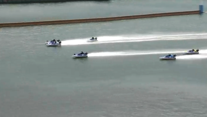 <かなり外へ流れてしまった一号艇と三号艇>