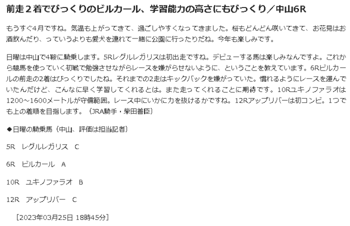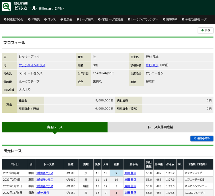 記録達成の立役者ビルカールのその後は、上掲の通り、所謂クラスの壁にぶち当たった感があり下位入線が続いたものの、直近の3月4日には十三番人気の低評価を大きく覆す2着入線と、突然の成長ぶりを見せつけてくれた。柴田善騎手曰く、キックバックに慣れたということらしいが、歯噛みした馬券師たちは多かろう。